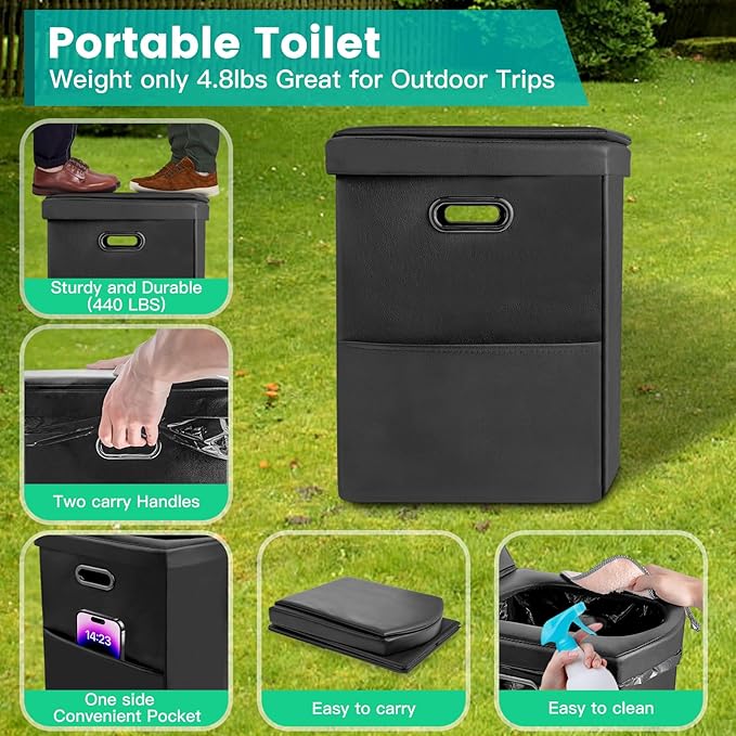 - SIMPLE TO USE: This folding portable toilet can be easily set up and fold down in seconds. The new upgraded version comes with two convenient handles for easy mobility,Equipped with a side pocket, convenient for storing small items such as mobile phones, toilet paper, trash bags, or other things.There are 15 replacement bags come with the package, have no worry about the replacement bags. And come with a Carry Bag for easy transport. You could place it anywhere.