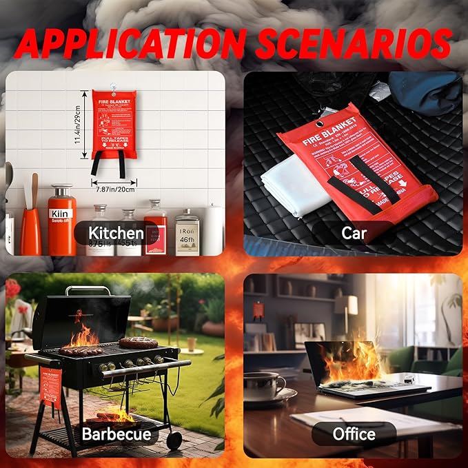 - 【Portable】: Protective measures should be taken indoors or outdoors. You can place the fire blanket in the kitchen, living room, or garden, or keep one in your car. The packed size is11.4'' x7.87'', it's also convenient to carry for outdoor activities, barbecues, and other outings. Each fire blanket is packed in a durable nylon hook and loop closure bag with a heavy-duty loop for hanging. You can hang it anywhere within reach