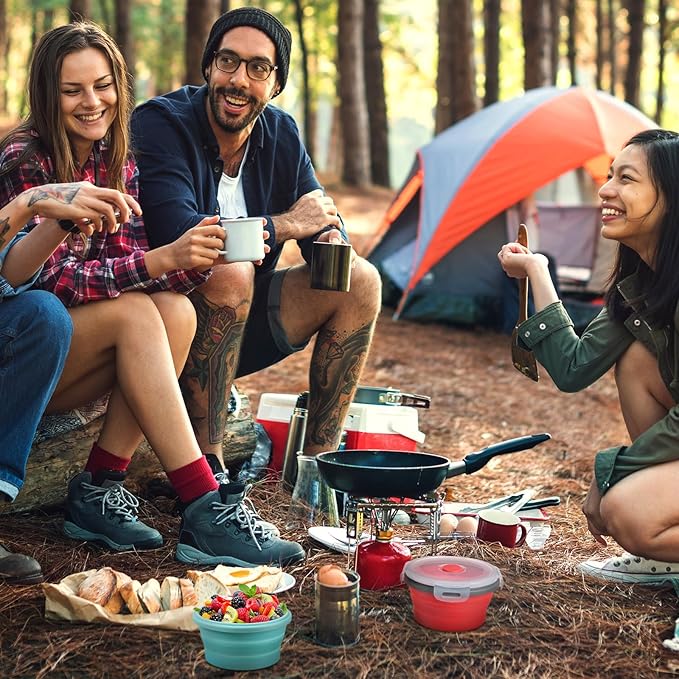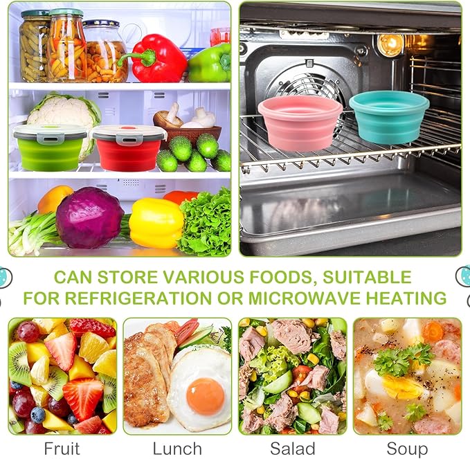 - Microwave, Fridge and Dishwasher Safe: these collapsible bowls with lids for camping accessories can heat in the microwave, or pour the rest of the food into the collapsible food storage containers with lids and put it in the fridge again; These collapsible kitchen items work as indoor and outdoor food storage containers, RV storage solutions, camping kitchen accessories, motorhome accessories for inside