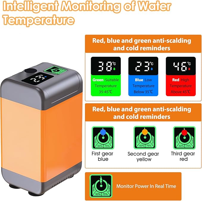 - 【Real-time Temperature Measurement】The portable shower for camping is equipped with a smart display that can measure the water temperature in real time, and three levels of anti-scalding and anti-cold reminders in red, blue, and green, so that the elderly and children can use it more safely. In addition, the display also has a power display, so you don’t have to worry about it suddenly running out of power.