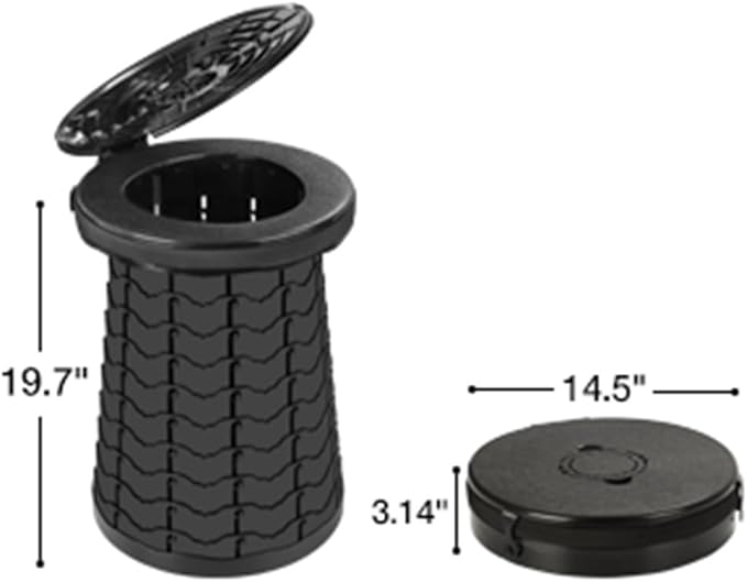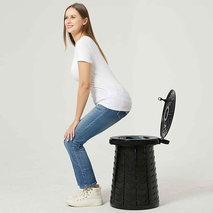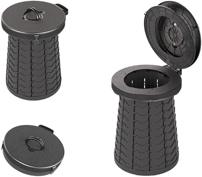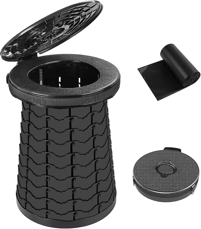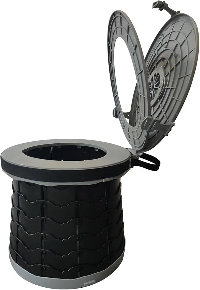 - 【Easy to Use and Widely Applicable】The camping toilet can be opened and closed in seconds, just one pull and twist counterclockwise. Our foldable toilet can be folded and with a strap, So the portable camping toilet is easy to store and carry. This portable toilet can not only be used as an emergency toilet, but also as a trash can, a stool and a side table. It is a perfect luggable loo for backpacking, travelling, camping, fishing, hiking, and more.