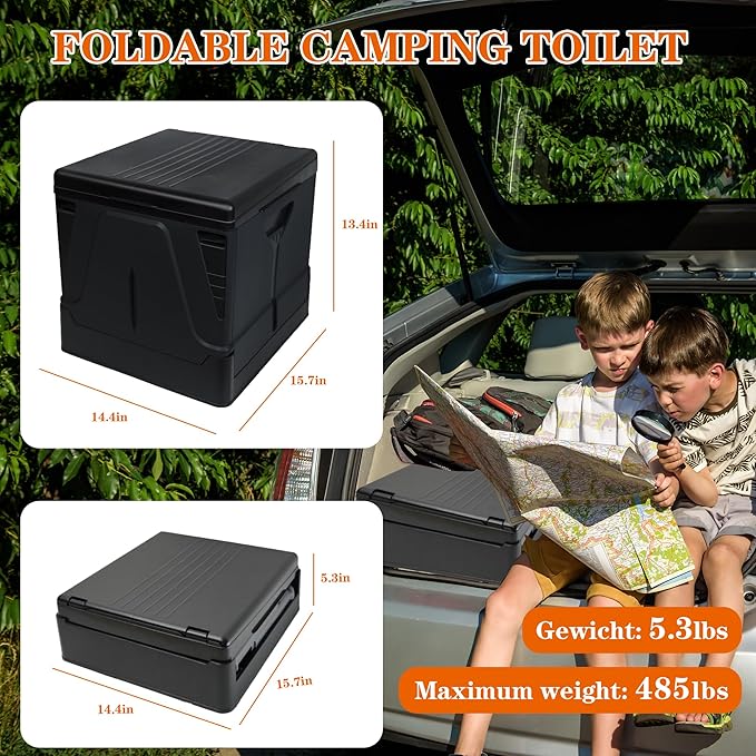 - ⛺Comfortable and Durable: Made of quality abs materials, sturdy and durable, with a maximum load capacity of 485lbs. The new folding toilet is almost the same size as a household toilet. Not only is the sitting position comfortable, but the size is also suitable.