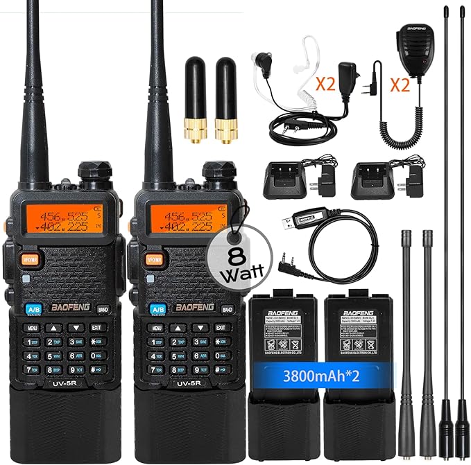 - Customer Service: If you encounter any problems, you can contact us anytime. We have a dedicated team to provide you with professional support and make every effort to resolve any issues you may encounter. The radio set includes:2 × BAOFENG UV-5R Ham Radio, 2 × 3800mAh Li-ion Battery; 2 × BF-771 High Gain Antenna; 1 × Programming Cable; 2 × Original Antenna; 2 × Power Adapter; 2 × Earpiece; 2 × Belt Clip; 2 × Hand Strap; 2 × User's manual.
