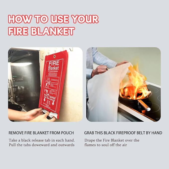 - Easy to use: Pull down tabs on the fire proof blanket, spread the blanket to cover the fire, let the fire blanket fire suppression blanket suffocate the fire, then turn off the heat source. Can also be used to cover the body for fire survival. Safe to drape over adults, children, pets, elders.