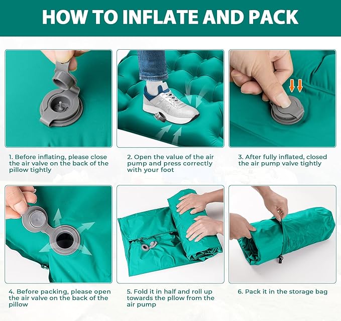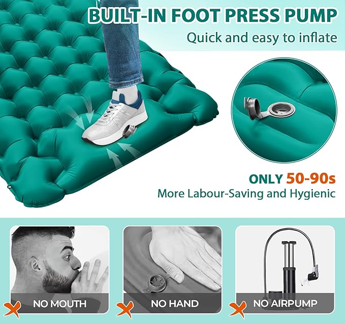 - ⛺ Fast Inflation Camping Pad - It's time to say goodbye to the hassle of inflating by mouth or carrying a bulky air pump. You can easily inflate it in about 50-90 second because the sleeping mat has a built-in foot pump. There is an anti leakage film in the valve, Inflate it once and it will last for several weeks.