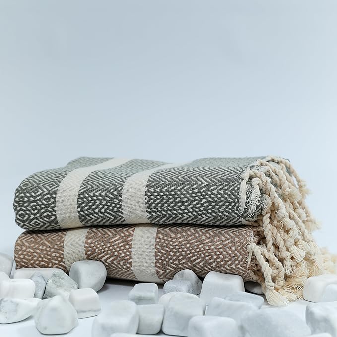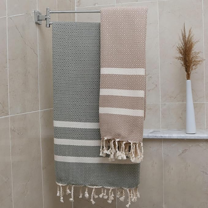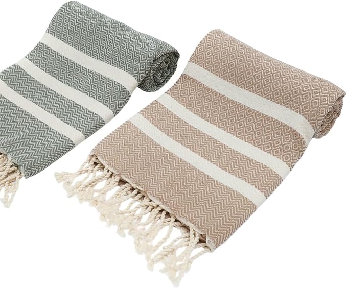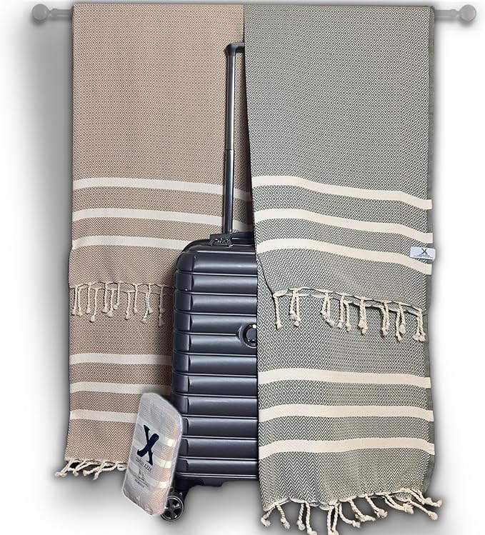 2 Set Oversized Turkish Bath Towel Sheets for Adults XXL Bathroom Extra Large Luxury Cotton Pool Peshtemal Washable Good Texture, Absorbency, Softness (Caramel Beige and Khaki Green)
