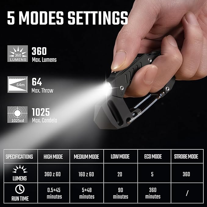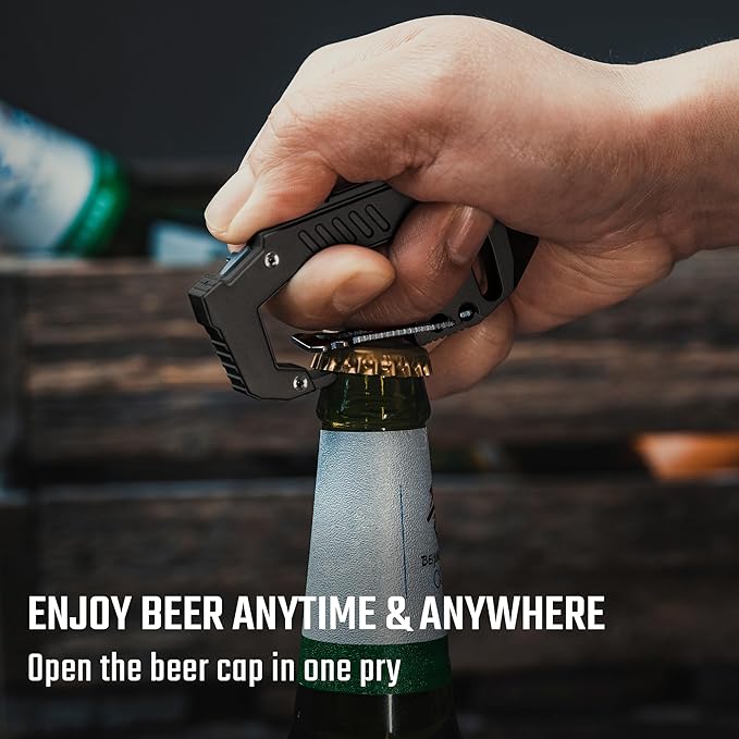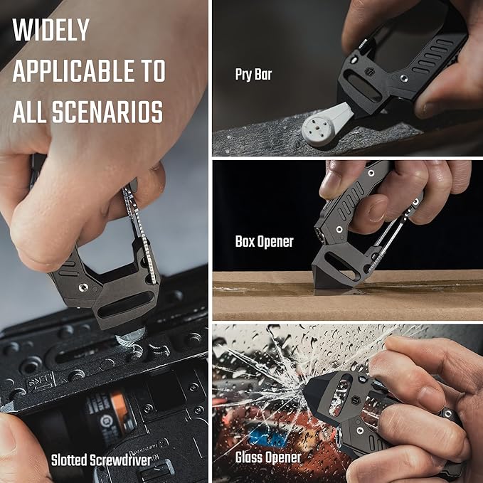 - 7 TOOLS IN 1 CARABINER: This multitool carabiner can be used as a EDC keychain, LED flashlight, bottle opener, slotted screwdriver, pry bar, box opener, also can be used as a glass breaker. It’s a utility keychain tool that great for daily use