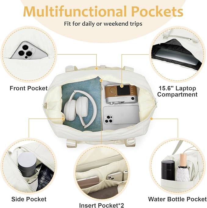 - Large Capacity & Multi-Pocket: This travel bag has multiple pockets, the main pocket has a wet/dry pocket, a separate pocket for a 15.6" laptop compartment, 2 interior insert pockets and a built-in mug pocket. The exterior has 2 side pockets and 1 front zippered pocket. Spacious design holds clothes, toiletries, water bottle, umbrella, laptop, mobile power, magazines, wallet and other travel or fitness essentials. Make your workout, business trip or travel more organized and convenient