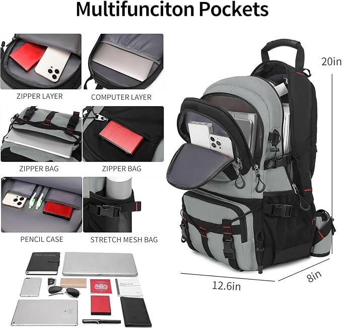 - Large Capacity: With 40L storage space, this backpack features with multi-compartment design includes one main zipped compartment, several front pockets with zippers and two side pockets. Large capacity helps you easily organize all your essential items.