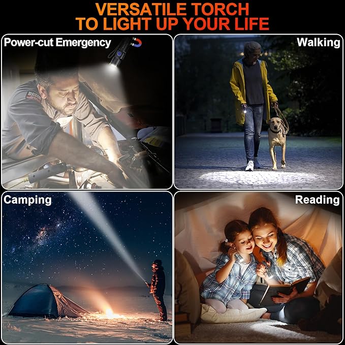 - 【Durable, Magnetic and Portable】Constructed of military-grade aluminum alloy with excellent hardness and 10-foot drop resistance. The flashlight's compact form and clip make it effortlessly portable, while the magnetic base provides stability on metal surfaces, lighting up hands-free environments. A great backup for camping tent, mechanic, home, basement, garden, car, or when electricity is not supplied due to hurricane, snowfall.