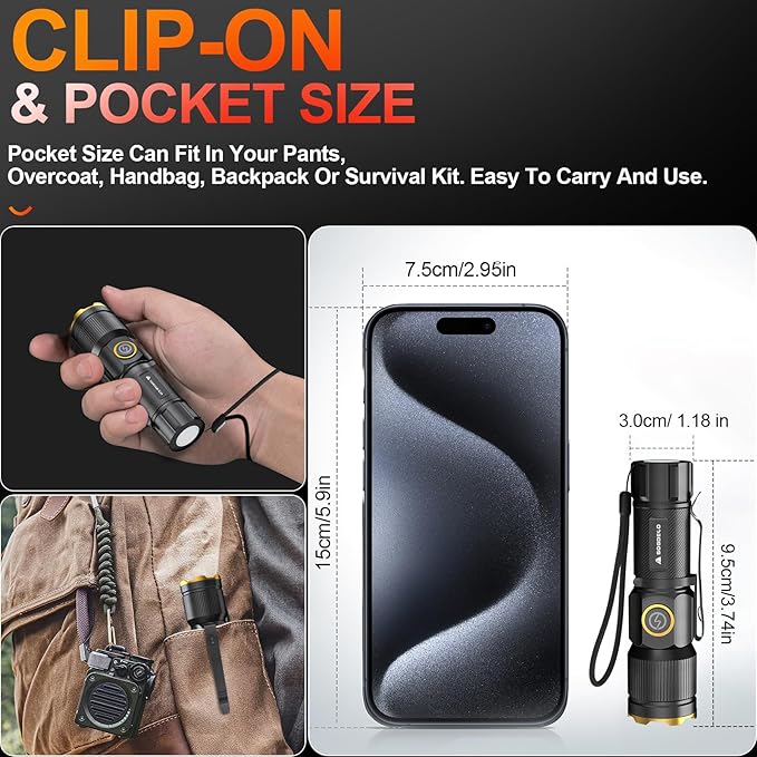 - 【4 Lighting Modes & Zoomable】Navigate through darkness with ease using our LED flashlight's 4 powerful modes: High, Medium, Low, and SOS. Instantly switch to High with a double-click, without having to go through all modes; Long-press activates Strobe mode (self-defense). Adjustable zoom allows floodlight or spotlight: zoom in for close work, out for long distance.