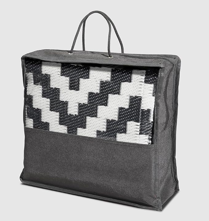 - Foldable camping rug - 100% recycled plastic tubes are tightly woven to create a sturdy portable rug and is compact for easy storage in your RV and campers.Comes with a portable carry bag.