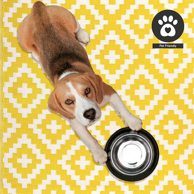 FH Home Outdoor Camping Rug - Waterproof, Fade Resistant, Reversible - Premium Recycled Plastic - Geometric - Large Patio, Deck, Sunroom, RV - Aztec - Yellow & White - 9 x 18 ft Foldable