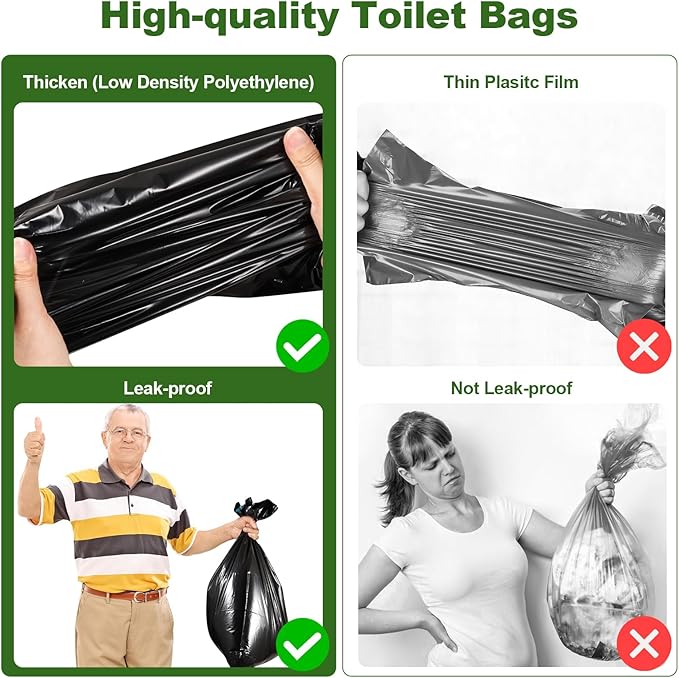 - Leak-proof Toilet Liners: OUMEE camping toilet bag is made of thicken & dual 2 Mil LDPE(Thicken Low Density Polyethylene) material, which is strong, no-leaking and enough large for holding a large amount of garbage