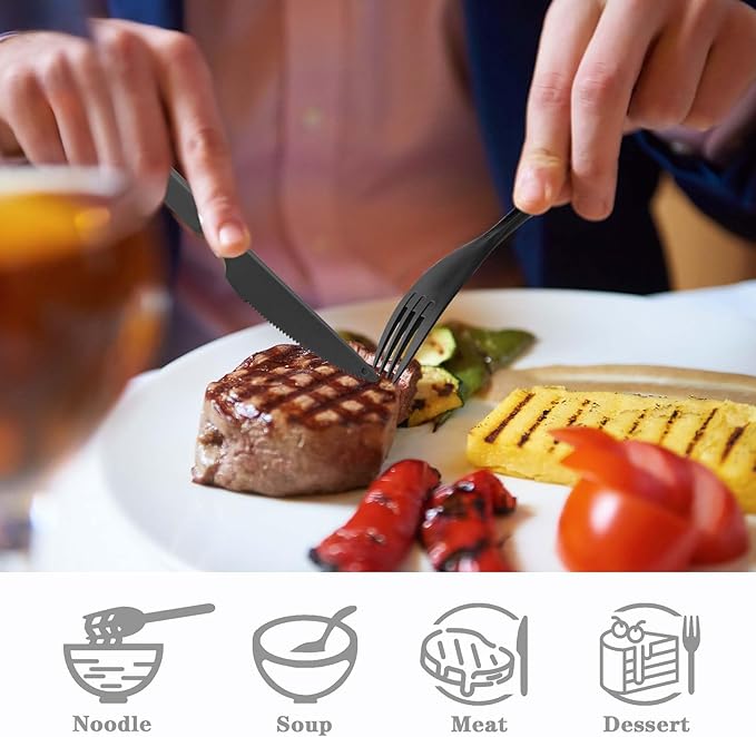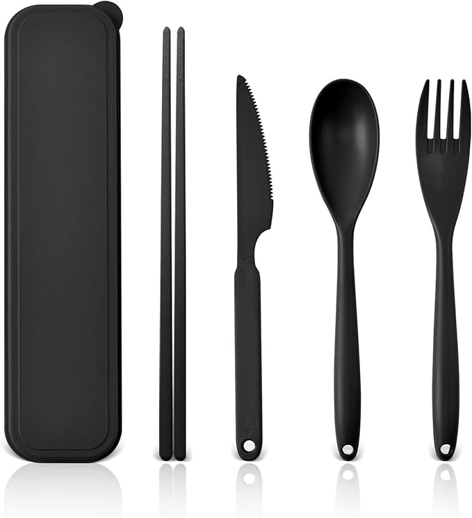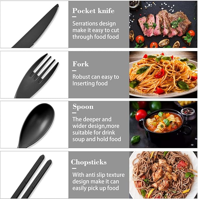 - 【Material and Portability】Our travel utensils are made of high quality plastic and reusable. Traditional stainless steel cutlery is too heavy and difficult to carry. Our colorful sets of flatware sets are small and lightweight for easy portability.