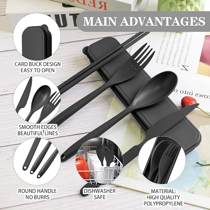 Large Reusable Travel Utensils Set with Case, Plastic Silverware Set for Adults Travel Picnic Camping, Portable Flatware Cutlery Set with Chopsticks for Daily Use(Black)