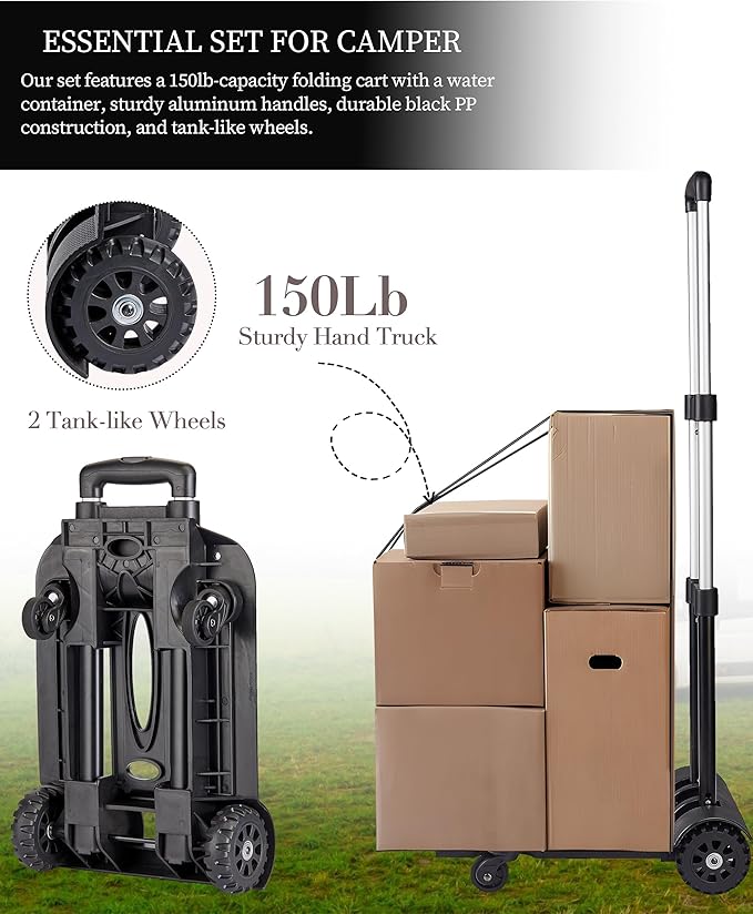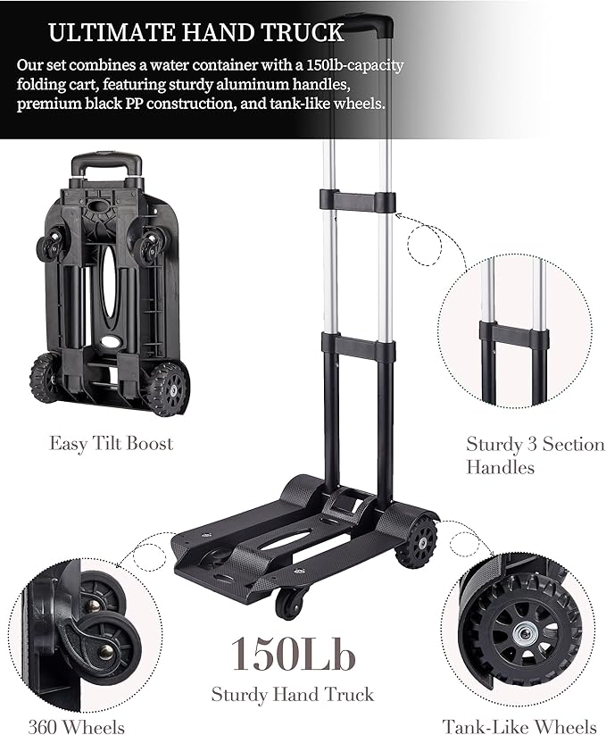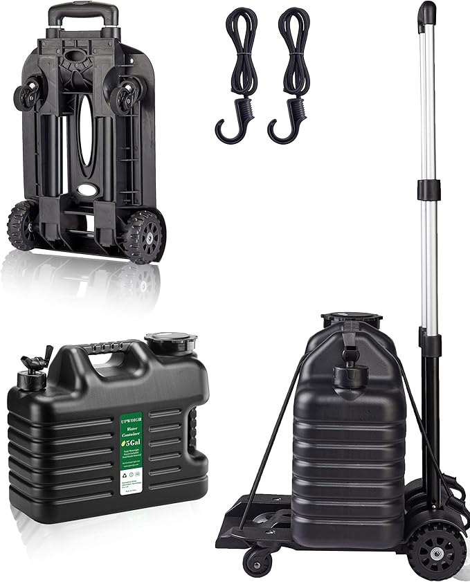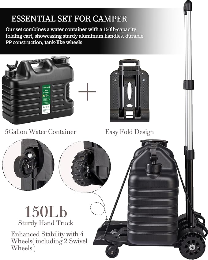 5 Gallon Water Jug and 150 lb Multifunctional Folding Hand Cart,Black Hand Truck,BPA Free Thickened Water Storage, Portable Luggage Cart with 2 Tank Wheels + 2 Swivel Wheels,Essential Camping Hiking