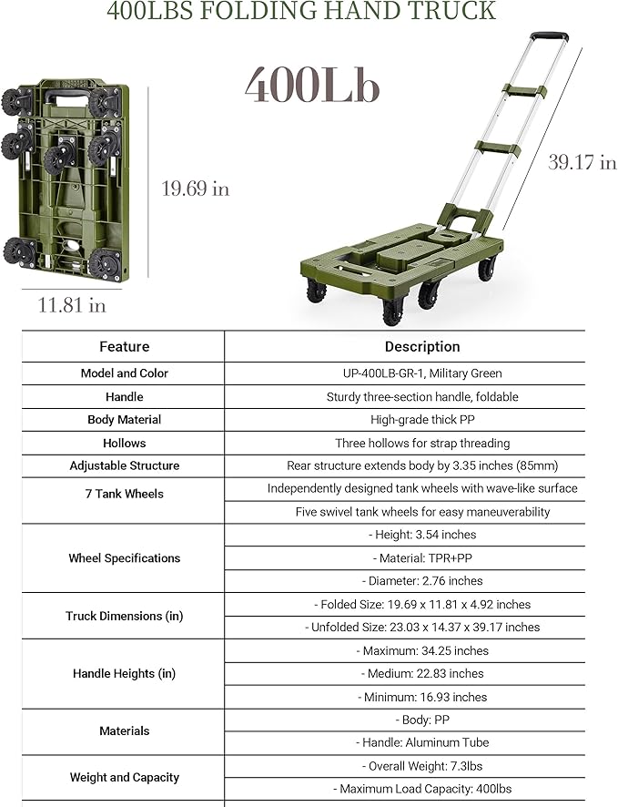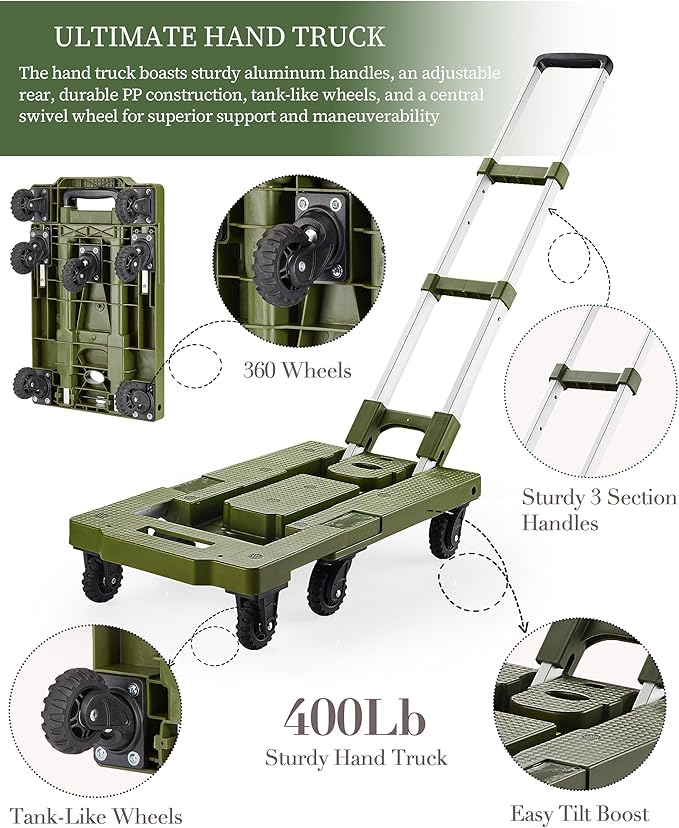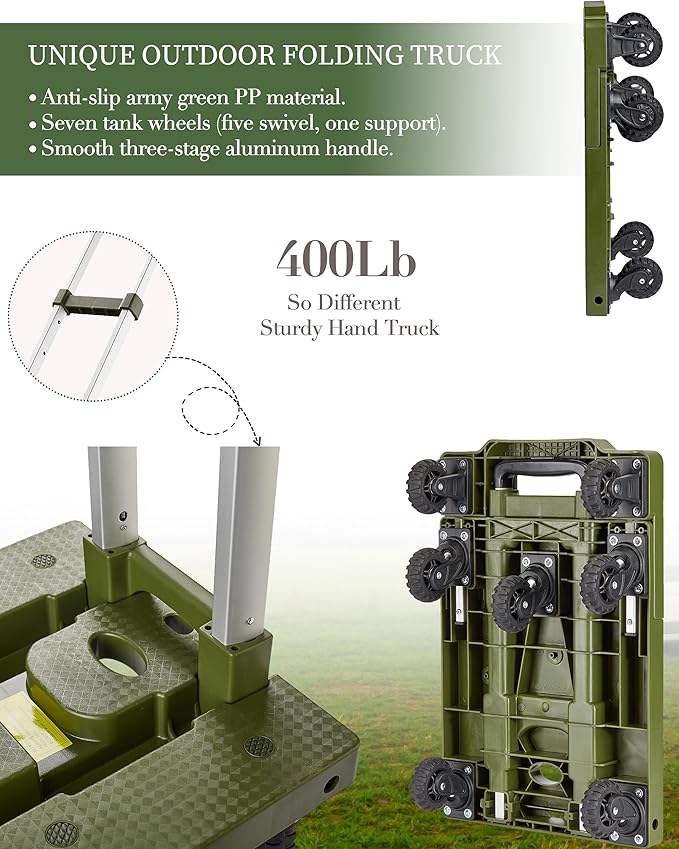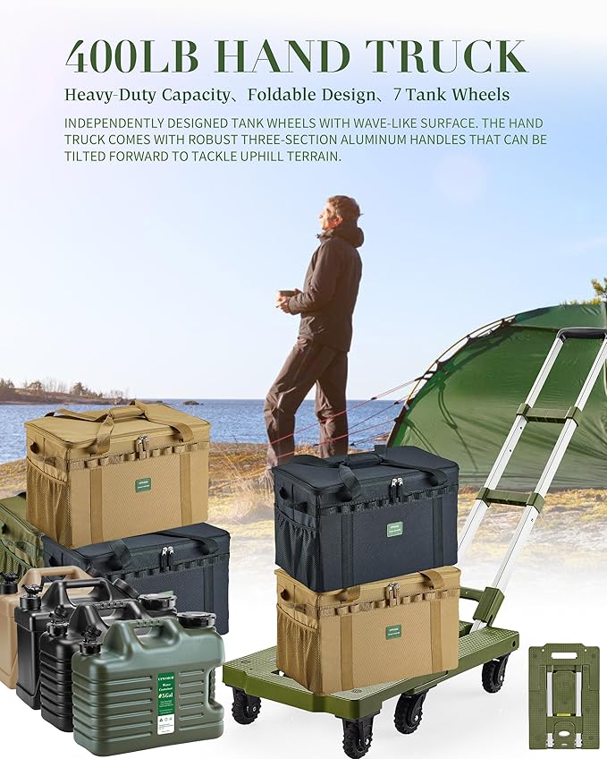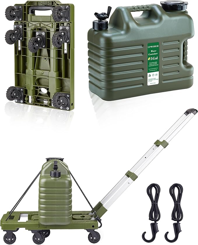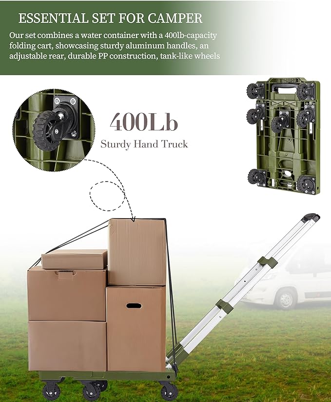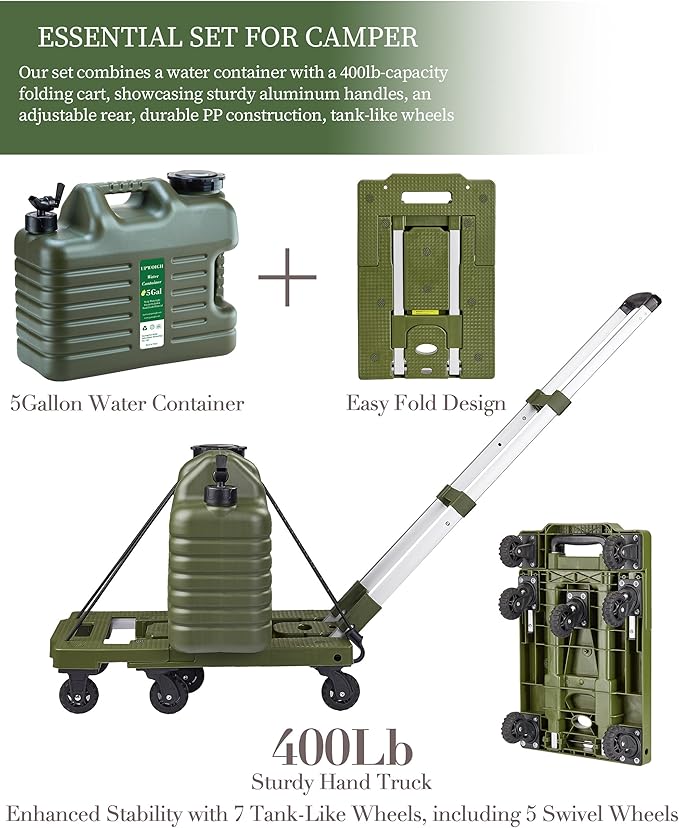 5 Gallon Water Jug and 400 LB Multifunctional Folding Hand Cart,Green Hand Truck,BPA Free Thickened Water Tank,Portable Luggage Cart with 7 Tank Wheels and 2 Bungee Cords,Essential for Camping Hiking