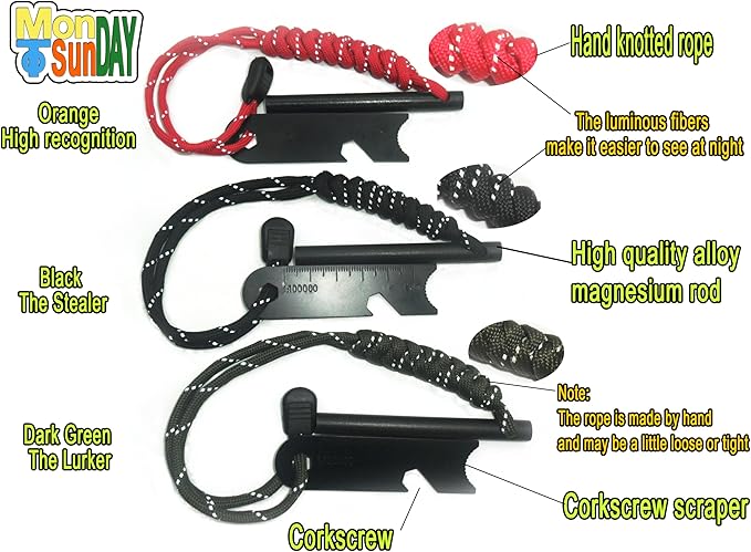 - 🔥The main functional part is the magnesium rod, which is composed of 6 metals with magnesium as the main component, and our unique formula ensures that it has the right hardness, which makes it easier to generate metal chips and thus generate enough sparks.