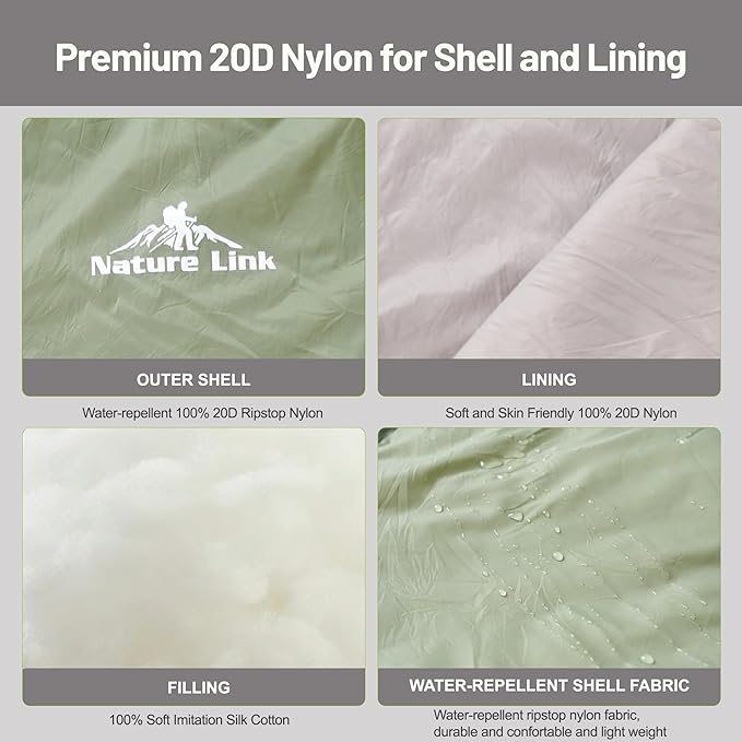 - DURABLE NYLON SHELL AND LINING: This sleeping bag is made of 20D ripstop nylon for shell which is water-repellent, and 20D soft nylon for lining, which is comfortable and skin-friendly, provide you with a warm relaxing sleep.