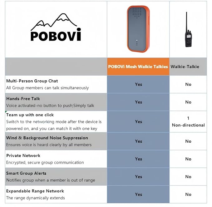 - 【MULTI-WAY VOICE CHAT】: POBOVi Mesh Communicator enables hands-free group communication while hiking, biking, skiing, or family picnics. Engage in real-time conversations without the push-to-talk constraints of traditional walkie-talkies. Easily form the team with just one touch.