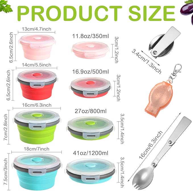 - Ideal Size and Capacity: you will get 4 different colors and capacity foldable camping bowls with lids, and 4 portable foldable forks, 4 boxes with keychains; The capacities of the 4 bowls are about 11.8 oz/ 350 ml, 16.9 oz/ 500 ml, 27 oz/ 800 ml, 40 oz/ 1200 ml, the fork is about 6.3 x 1.3 inches/ 16 x 3.4 cm, fits well for a pocket, purse, backpack, suitcase, gloved storage and takes up little space