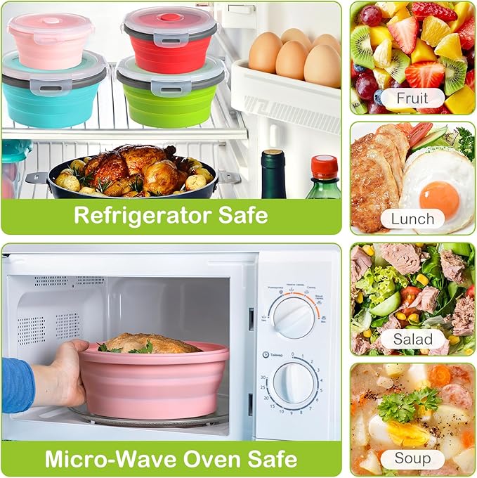 - Microwave, Fridge and Dishwasher Safe: these collapsible bowls with lids for camping accessories can heat in the microwave, or pour the rest of the food into these collapsible food storage containers with lids and put it in the fridge again; These collapsible kitchen items work as indoor and outdoor food storage containers, RV storage supplies, camping kitchen accessories, motorhome accessories for inside