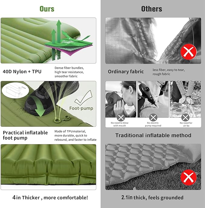 - Durable & Comfortable Sleeping Pad : Crafted from high-quality double-layer nylon (40D+60D) with a TPU coating, this camping mattress pad is built to withstand the toughest conditions while providing exceptional durability and tear resistance