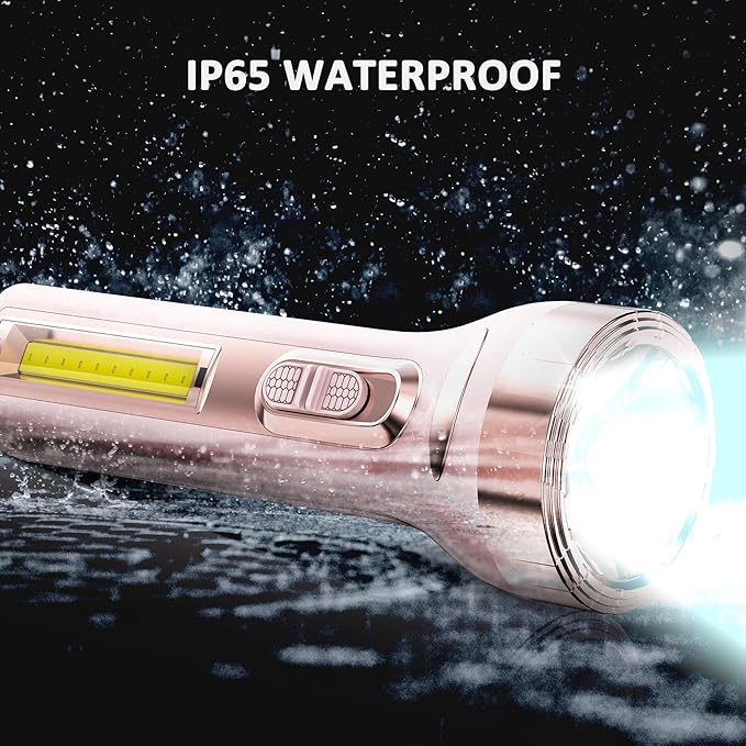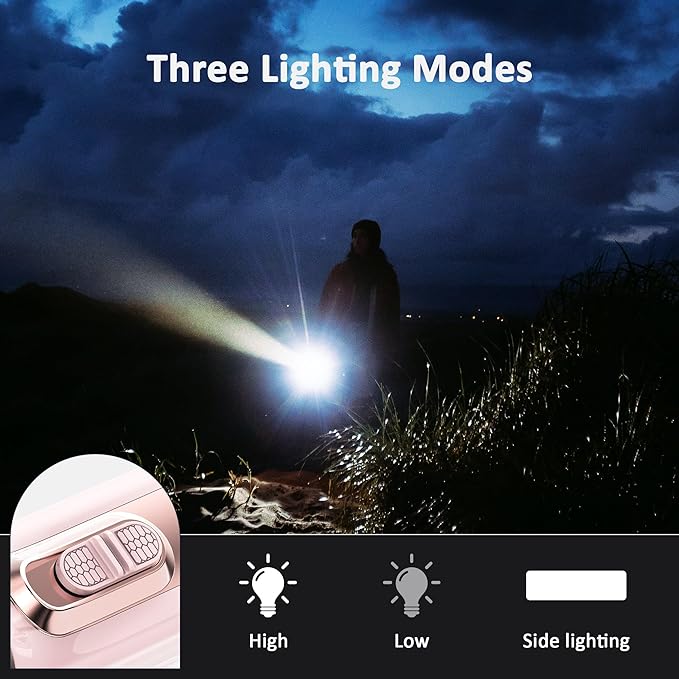 - [Multi-functional Flashlight]: Rechargeable LED flashlight, Main light, and sidelights, Three lighting modes( low high sidelight), 1000 lumens of brightness