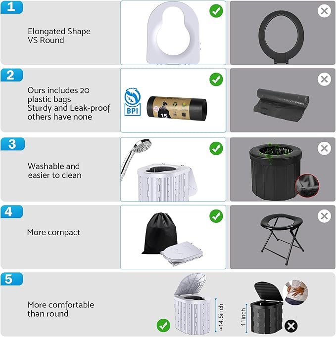 - 🚽【Unparalleled Comfort】The new Foldable Portable Toilet For Camping, Newly Designed Elongated-Shaped 12In Bucket Toilet Seat Is Just Like The One In Your Home. It Is Higher Wider, The Larger Size And Wider Portable Toilet For Adults Brings A More relaxed experience. Very suitable for male, female etc.