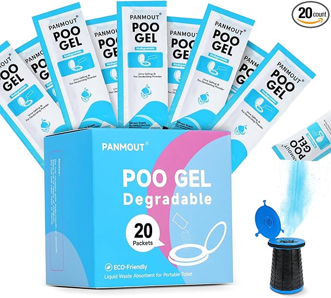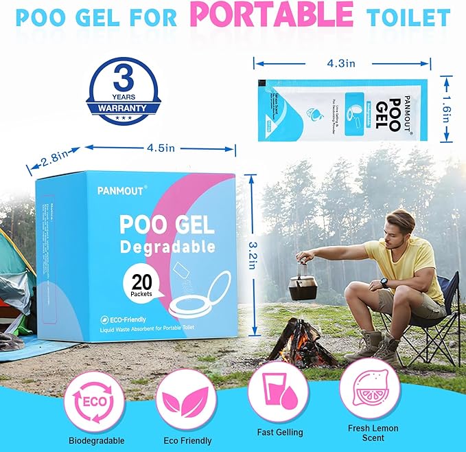 - 【Fast Absorption Gel Powder】Panmout portable toilet gel powder uses super absorbent polymer as the main components. The camping toilet gel will quickly turns liquid waste into a solid gel within 2 minutes and makes transporting and clean up at the campsite simple; Pleasant lemon fragrance can be effectively helps mask unpleasant odors.
