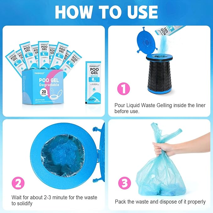 - 【Wide Application】Panmout portable toilet poo powder is suitable for camping portable toilet, mobile toilet, emergency toilet, or any place far away from modern conveniences. In addition, portable camping toilet poo gel is widely applicable to emergencies in families, hospitals and nursing centers.