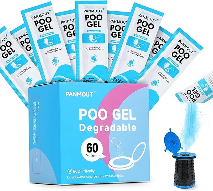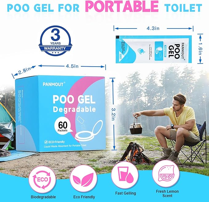 - 【Fast Absorption Gel Powder】Panmout portable toilet gel powder uses super absorbent polymer as the main components. The camping toilet gel will quickly turns liquid waste into a solid gel within 2 minutes and makes transporting and clean up at the campsite simple; Pleasant lemon fragrance can be effectively helps mask unpleasant odors.