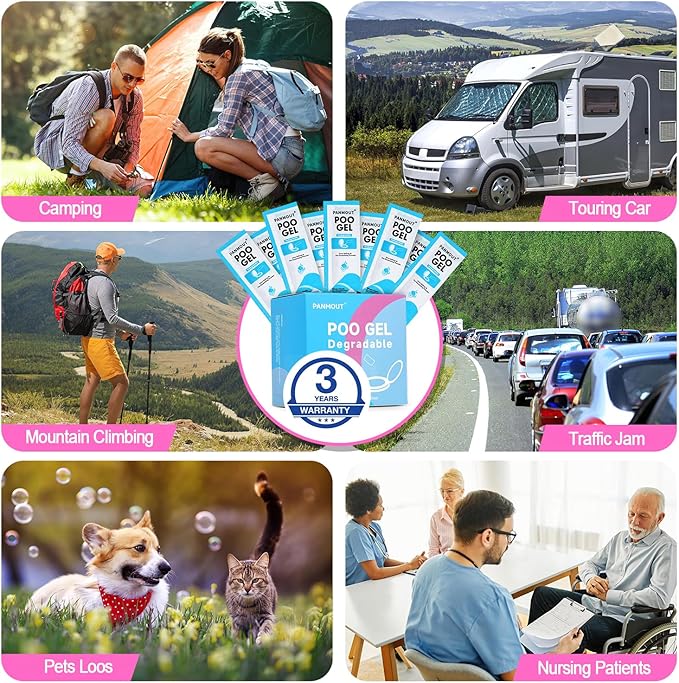 - 【Wide Application】Panmout portable toilet poo powder is suitable for camping portable toilet, mobile toilet, emergency toilet, or any place far away from modern conveniences. In addition, portable camping toilet poo gel is widely applicable to emergencies in families, hospitals and nursing centers.