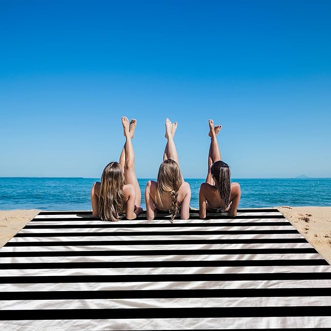 Large Beach Blanket, Black & White Stripe Beach Mat Sand Free Waterproof, Polyester Picnic Blankets Sandproof Stainproof Oversized 9 Ft X 10 Ft for 8 Adults, Beach Essentials Accessories