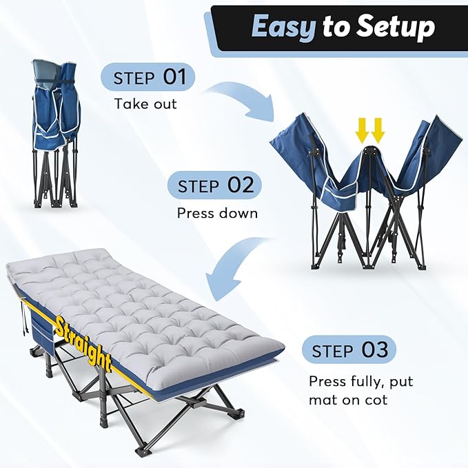 - Portable & Folding--Camping cots offer the convenience of easy portability, allowing you to set up a comfortable sleeping space anywhere you go, lightweight(23.3 lbs), foldable, come with Oxford bag for hassle-free transportation. Say goodbye to uncomfortable sleeping arrangements on the ground.