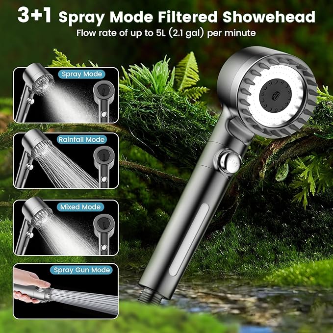 - Upgraded Filtered Showerhead: Eliminates 99.99% of chlorine to lessen skin and hair dryness and irritation. This showerhead softens hard water, protecting against skin and hair damage, with an 18-layer filtration system removing diverse impurities. Replace the filter cartridge every 9-12 months based on water quality.