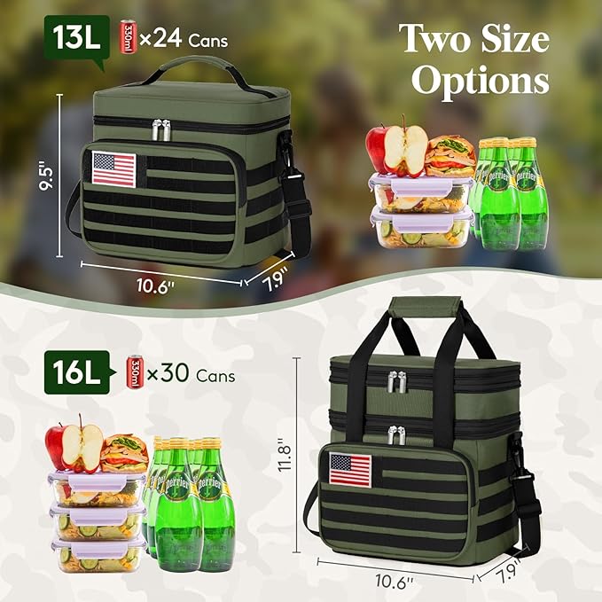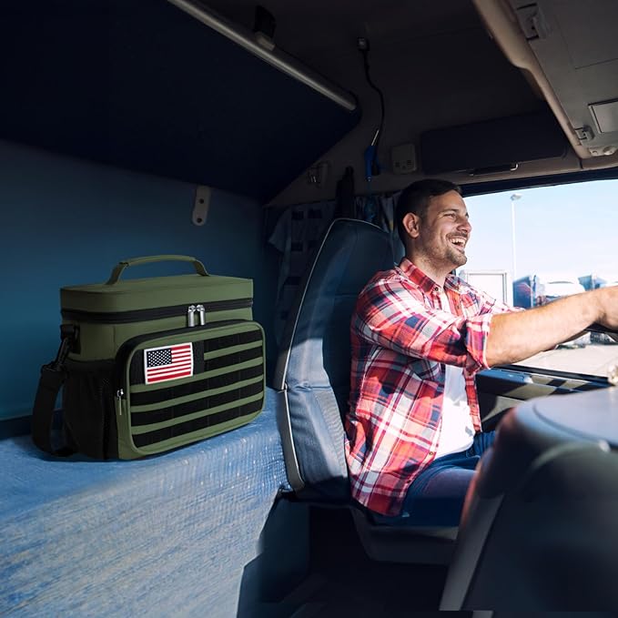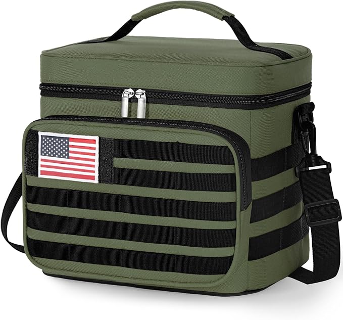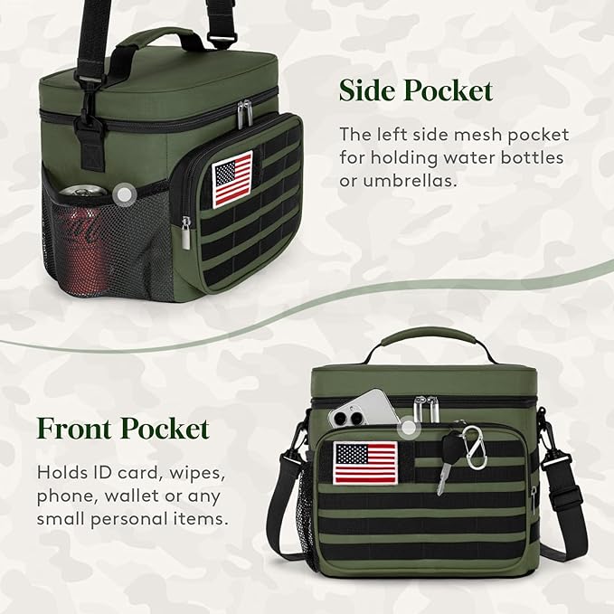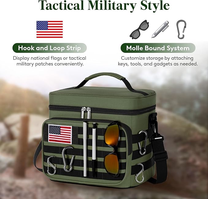 - Tactical Style: Our lunch box for men is perfect for outdoor enthusiasts and military fans. With a classic military-style design featuring MOLLE webbing for extra attachments. The front pocket’s hook and loop strip for displaying national flags or military patches shows your unique style and personality.