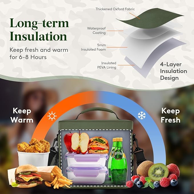 - Long-term Insulation: Our tactical lunch bag for men features a 4-layer insulation design. The interior boasts thickened PEVA material with the addition of a 5mm insulated foam layer, which keeps food cold, hot, or fresh for 6-8 hours. Perfect for carrying food for work or long periods of outdoor activities.