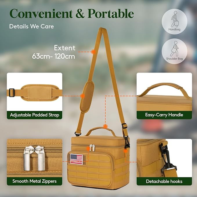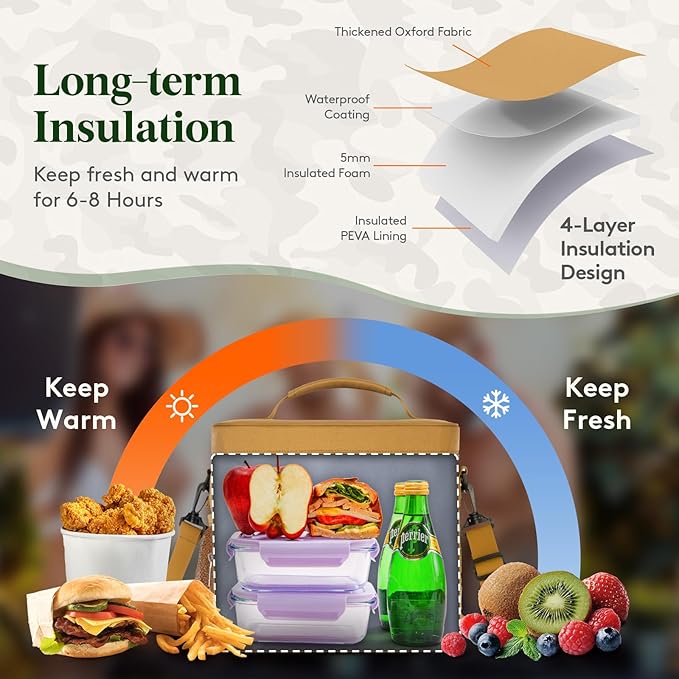 - Long-term Insulation: Our tactical lunch bag for men features a 4-layer insulation design. The interior boasts thickened PEVA material with the addition of a 5mm insulated foam layer, which keeps food cold, hot, or fresh for 6-8 hours. Perfect for carrying food for work or long periods of outdoor activities.