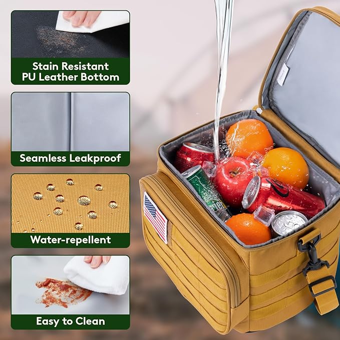 - Leakproof & Water-Resist: Guard against leaks with extra-thick PEVA liner and hot-pressed seams. Easy to clean spills with a quick wipe. With outer 600D water-resist Oxford fabric and non-slip PU leather bottom that resists dirt and abrasions, the heavy-duty lunch box for men will stay immaculate, even in the face of splatters and rain.