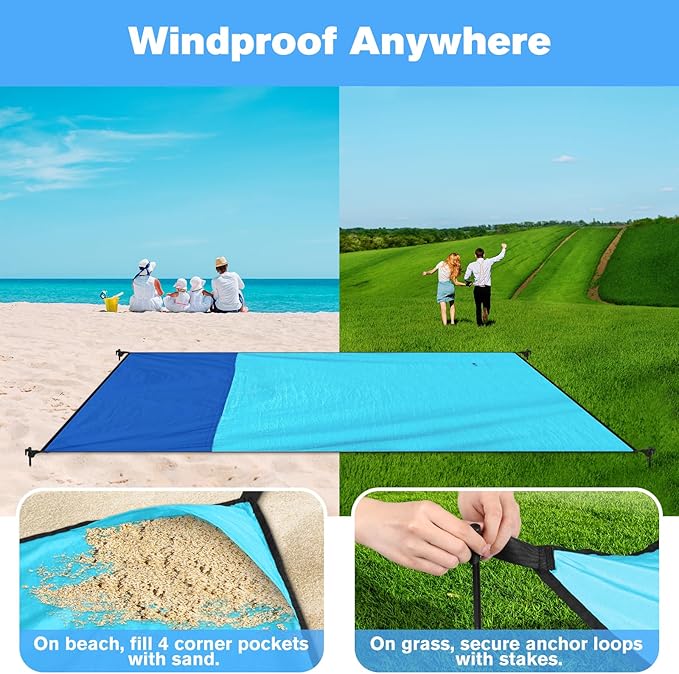 - 【Sand Resistance & Windproof】Outdoor beach blanket is sand proof and quick drying. Just shake it gently, the sand slips off easily. Comes with 4 lager corner sand pockets, 4 anchor loops and 4 pieces ABS stakes. Secure blanket on beach / grass with sand and stakes to prevent blanket blowing away on windy days.