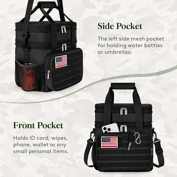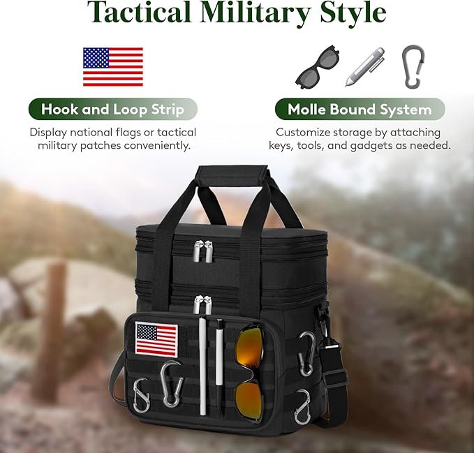 - Tactical Style: Our lunch box for men is perfect for outdoor enthusiasts and military fans. With a classic military-style design featuring MOLLE webbing for extra attachments. The front pocket’s hook and loop strip for displaying national flags or military patches shows your unique style and personality.