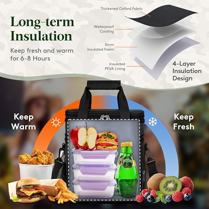 - Long-term Insulation: Our tactical lunch bag for men features a 4-layer insulation design. The interior boasts thickened PEVA material with the addition of a 5mm insulated foam layer, which keeps food cold, hot, or fresh for 6-8 hours. Perfect for carrying food for work or long periods of outdoor activities.