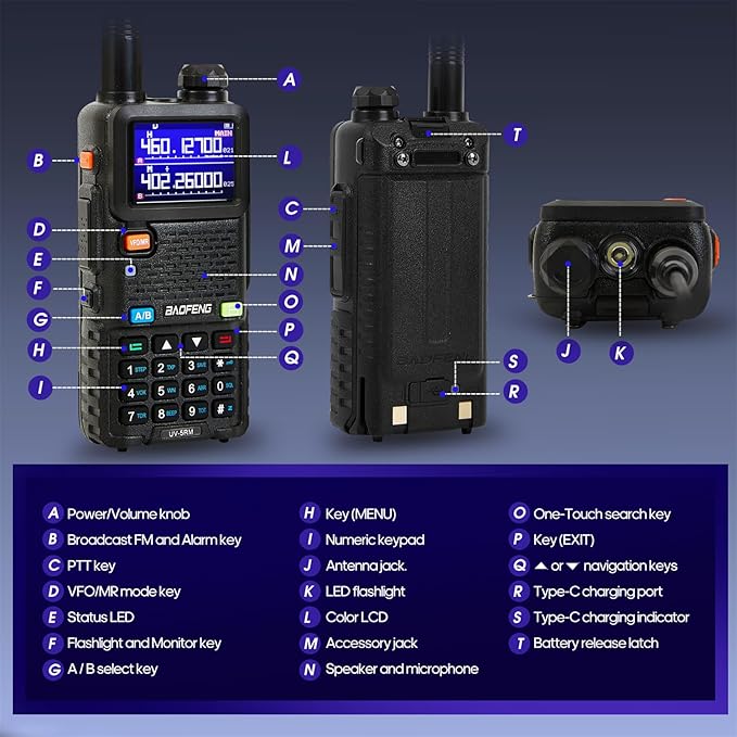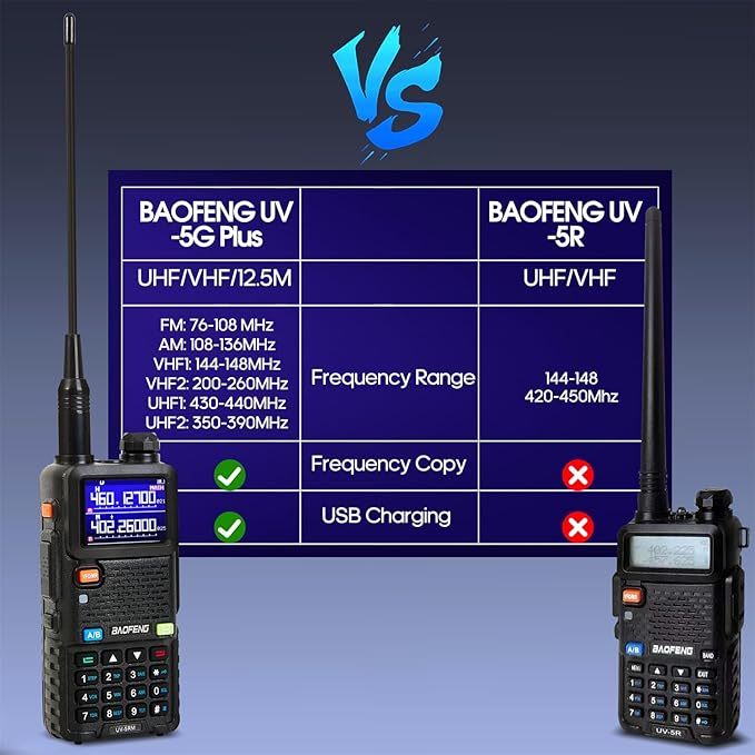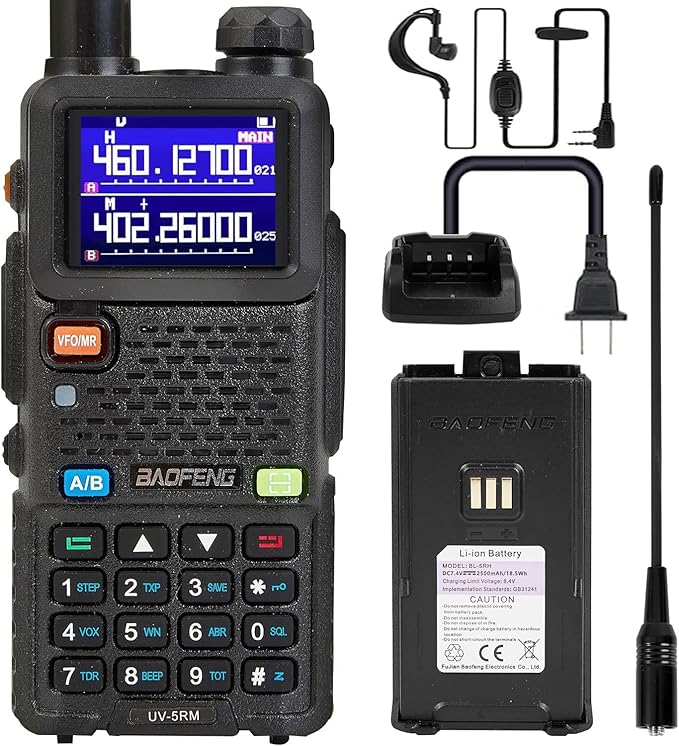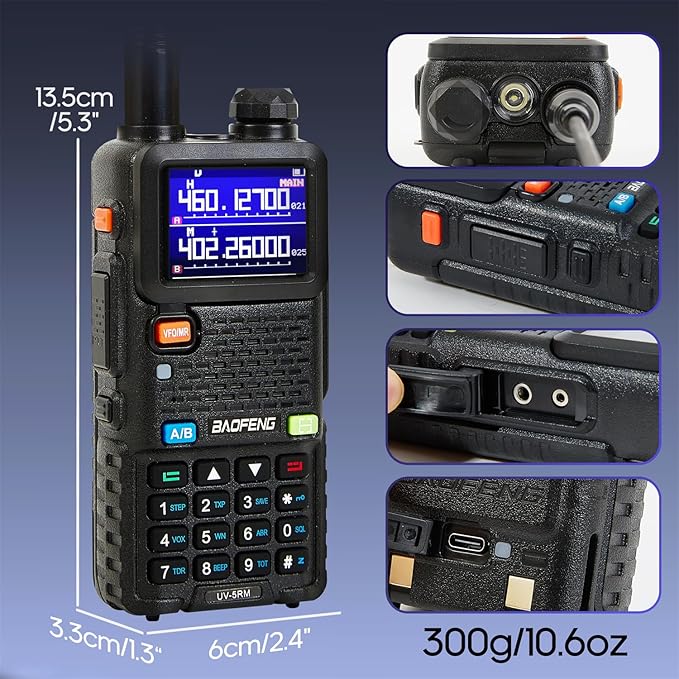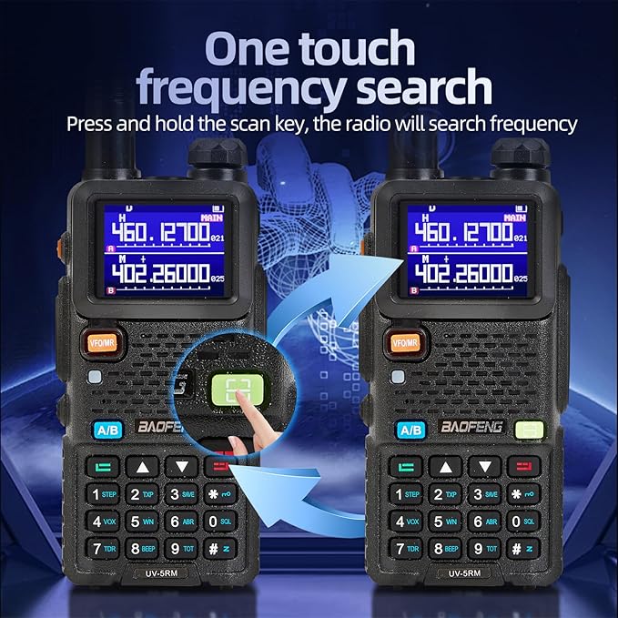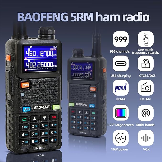 - BAOFENG 5rm: Enhanced version of the BAOFENG UV-5R, 999 channels, USB charging, one touch frequency match. The color display with large characters enhances visibility