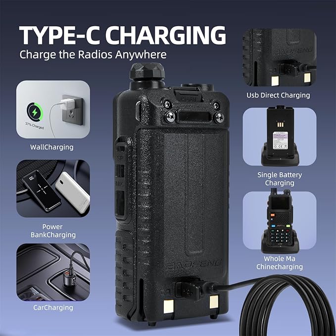 - Type-C charging&2500mAh battery: The ham radio supports charging with included charging base and USB cable(not included), charging your BAOFENG ham radio in the car, power bank, laptop, or any USB interface device anytime and anywhere