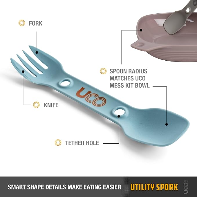 - Made from durable nylon, the spork features a fork, spoon, and serrated edge for cutting to enjoy meals on-the-go. The ergonomic camping utensil measures 7 inches and weighs 0.5 ounces.