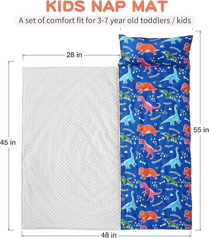 - ALL PURPOSE NAP MATS: The nap mat blanket simplifies life for both parents and kids. This set consists of a built-in sleeping pad, a plush blanket, and a pillow that can be removed when machine washing the mat.