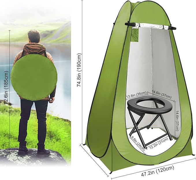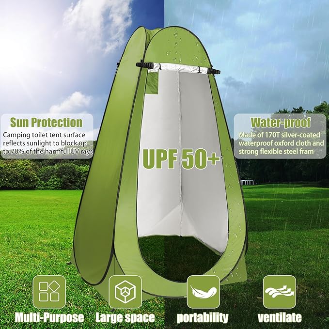 - INNOVATIVE POP-UP SHOWER TENT - SPACIOUS & GOOD PRIVACY: Toilet Tent is 47.2" L x 47,2"W x 74.8" H and offers a spacious interior shelter that comfortably fits a tall man without touching your head. It is made of 170T thickened waterproof Oxford cloth and strong flexible steel frame, light transmission is weak, even in bright light will not expose the outline of the figure. The silver coating on the inside effectively blocks up to 70% of harmful UV rays.