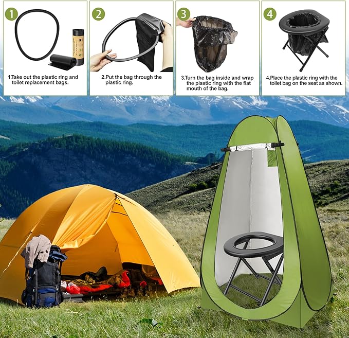 - ACKAGE LIST: NOTE: ASSEMBLY IS REQUIRED. 1x Pop up Shower Tent + 1x Portable Camping Toilet + 1 Roll Toilet Bags(15 bags each roll) + 1 x Carry Bag + 1 x Instruction. If you need to order toilet bags separately, ASIN: B0CD259Q1J. If you're not satisfied with this item at any time within one month of purchase, we'll provide a refund or replacement.